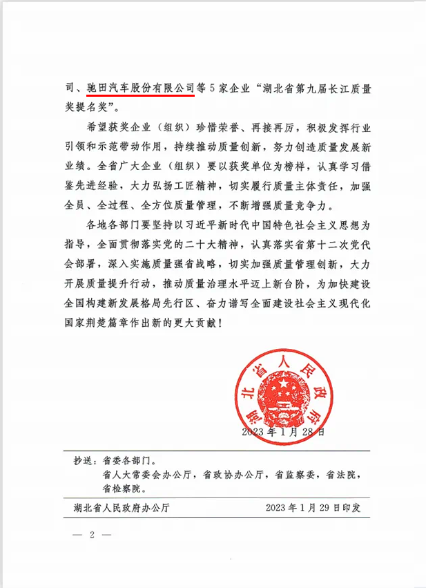 9月5日,湖北省举行第九届长江质量奖颁奖仪式。尊龙凯时(中国)人生就是搏汽车股份有限公司荣获“湖北省第九届长江质量奖提名奖”。作为十堰市唯一的获奖企业,公司董事长黄玉鸿先生亲临现场领取此项荣誉。